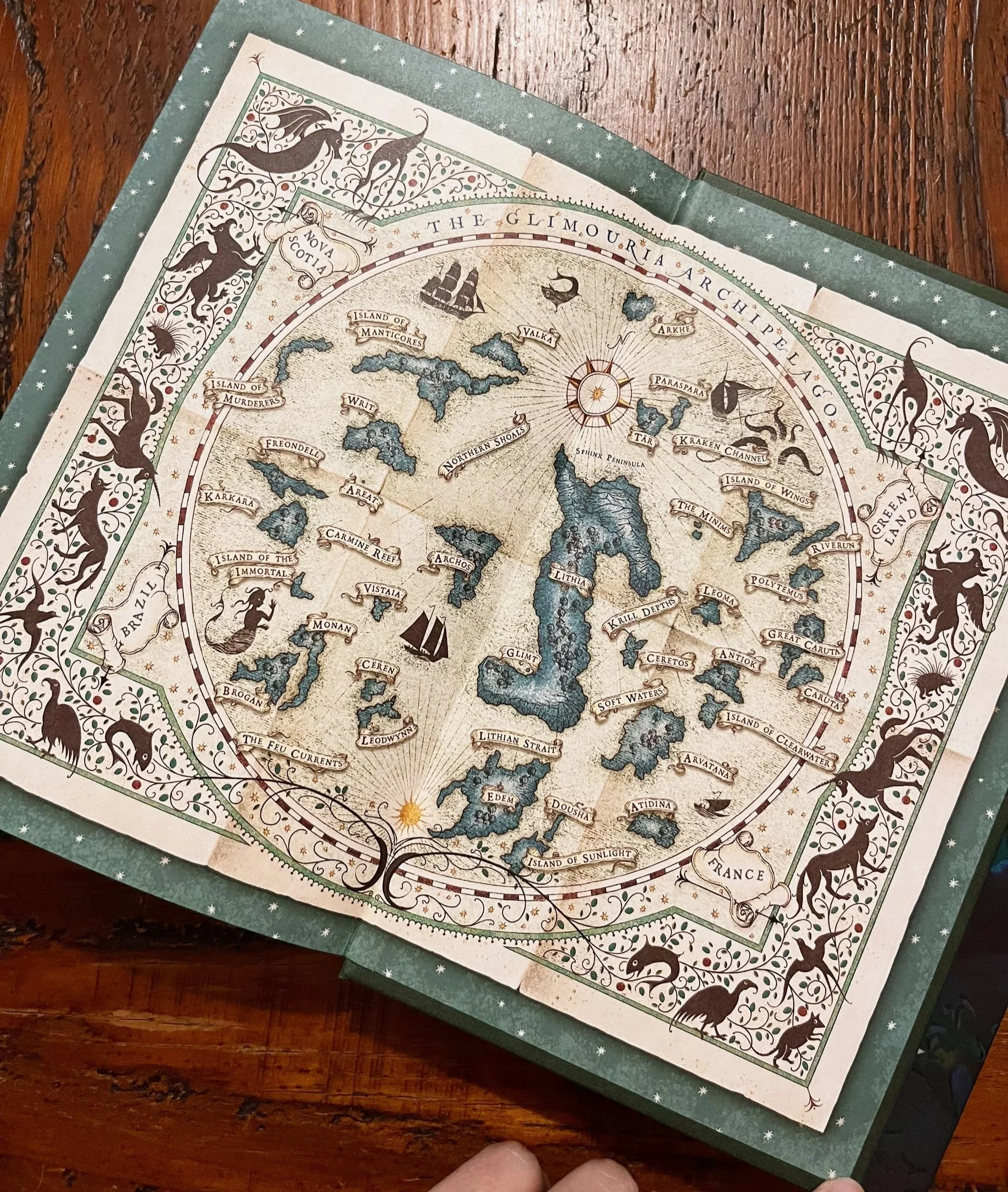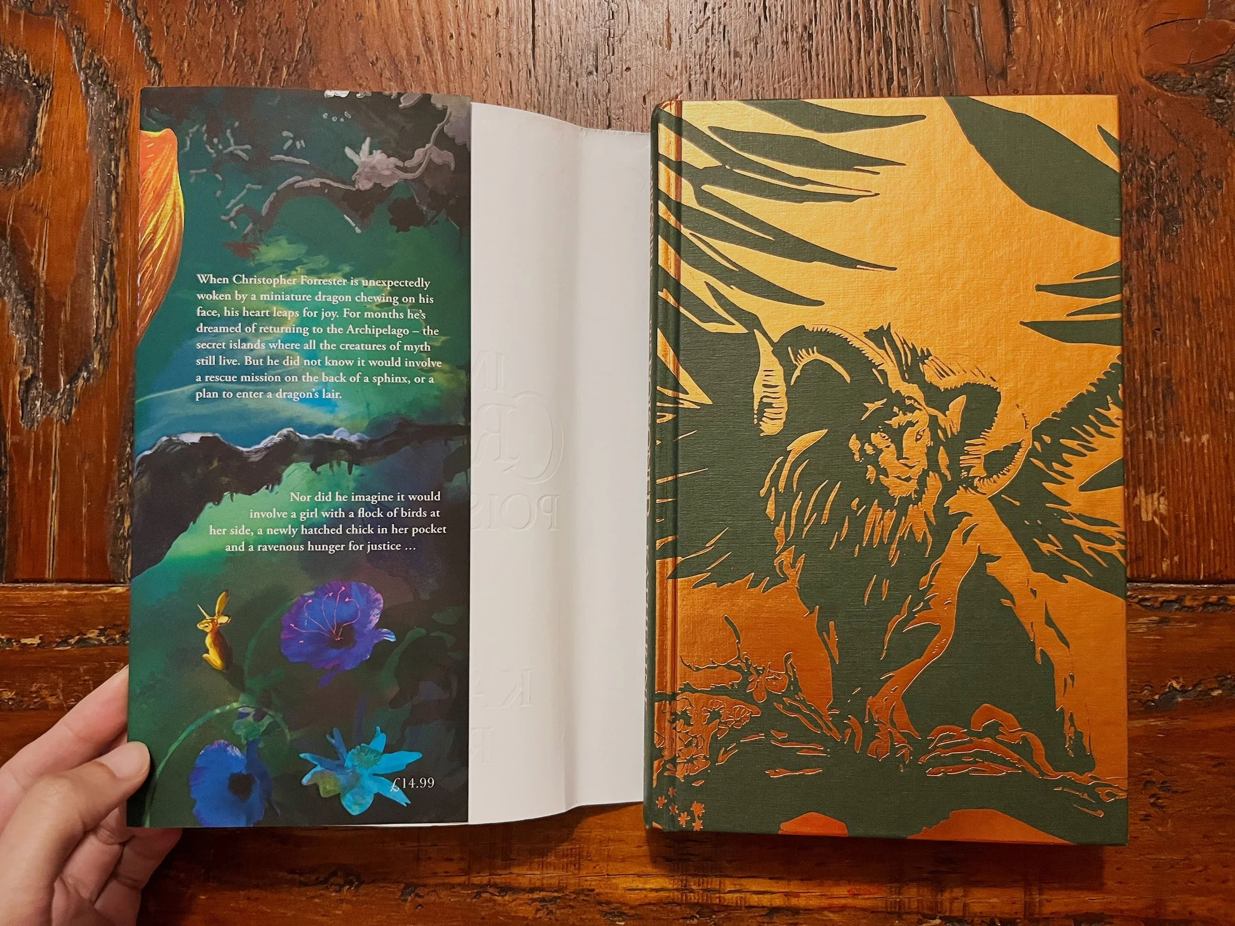 I want to finish off by taking a moment to admire the gorgeous edition I purchased at the book talk, pre-signed by the author. It’s a hard cover with a foiled, embossed book jacket, and the cover underneath is STUNNING. The page’s edges are dyed green, there’s a beautifully illustrated map (in full colour at the back of the book), a bestiary (guide to the various fantastical creatures), and small illustrations at the top of each chapter.